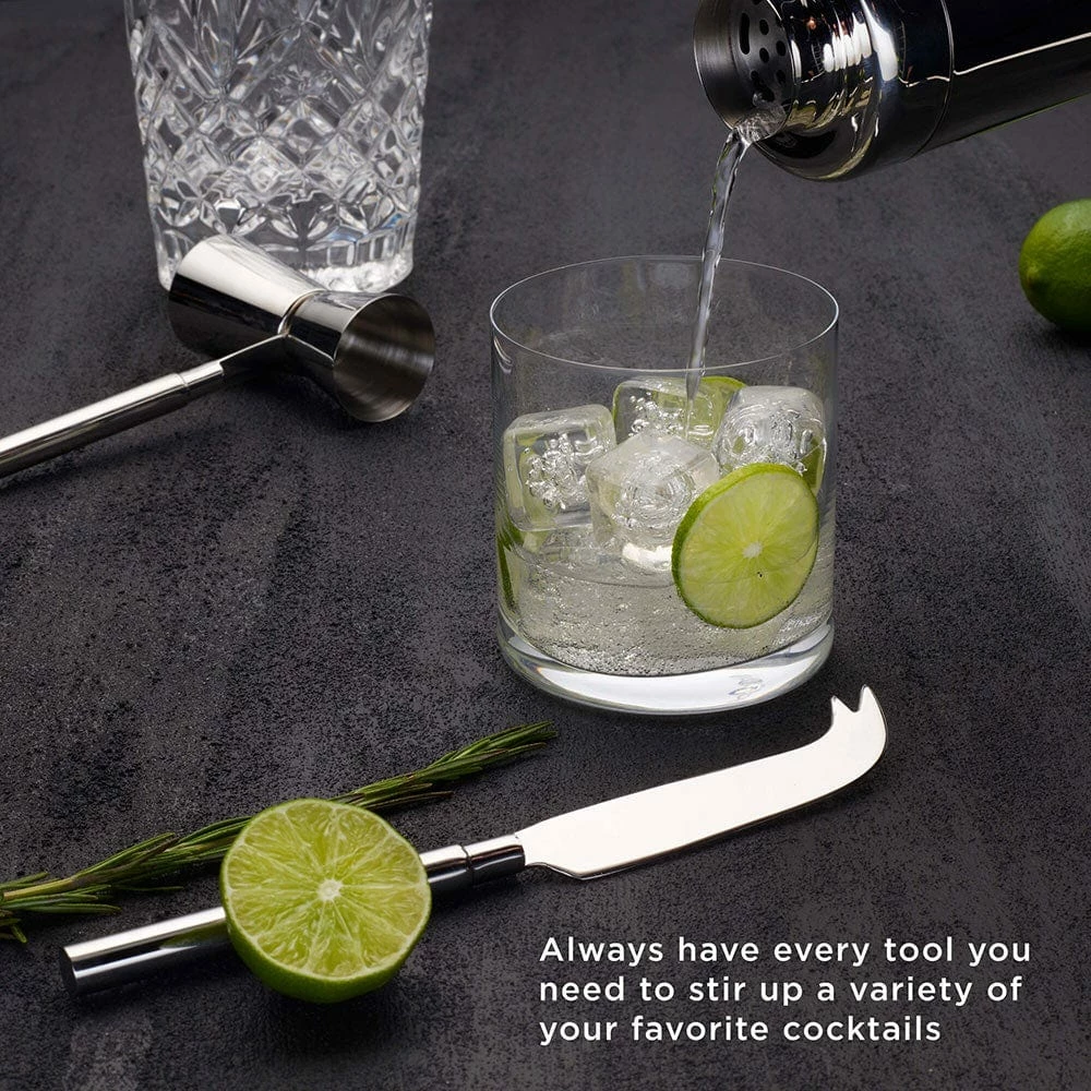 • 8 Piece Set includes (1) each of: Shaker, Cap Lifter, Bar Knife, Strainer, Muddler, Double Jigger, Ice Tongs, all kept neat and tidy in the included wood stand