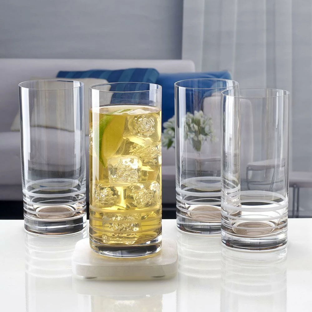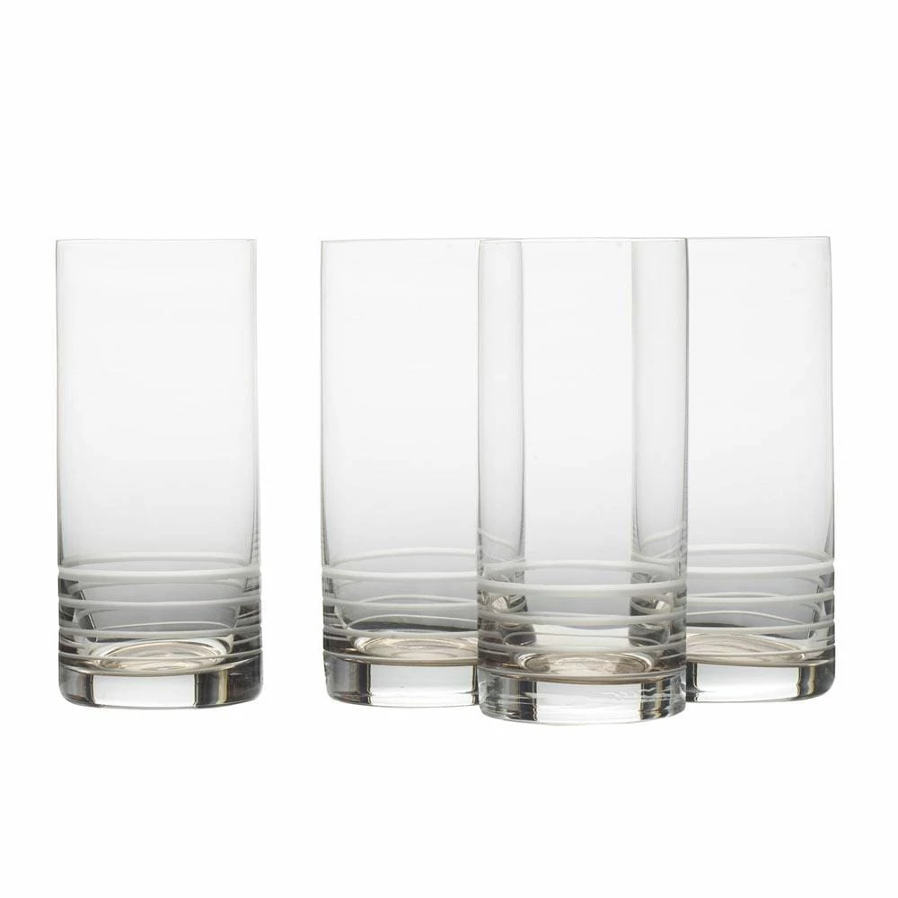 Bring a fresh look and a splash of color to any occasion with this Mikasa Cal Set of 4 Blue Ombre Highball Glasses. These stylish and contemporary glasses are highlighted by a smoke tint that begins at the base and fades upward into distinct, horizontal cut lines, creating a visually arresting effect.