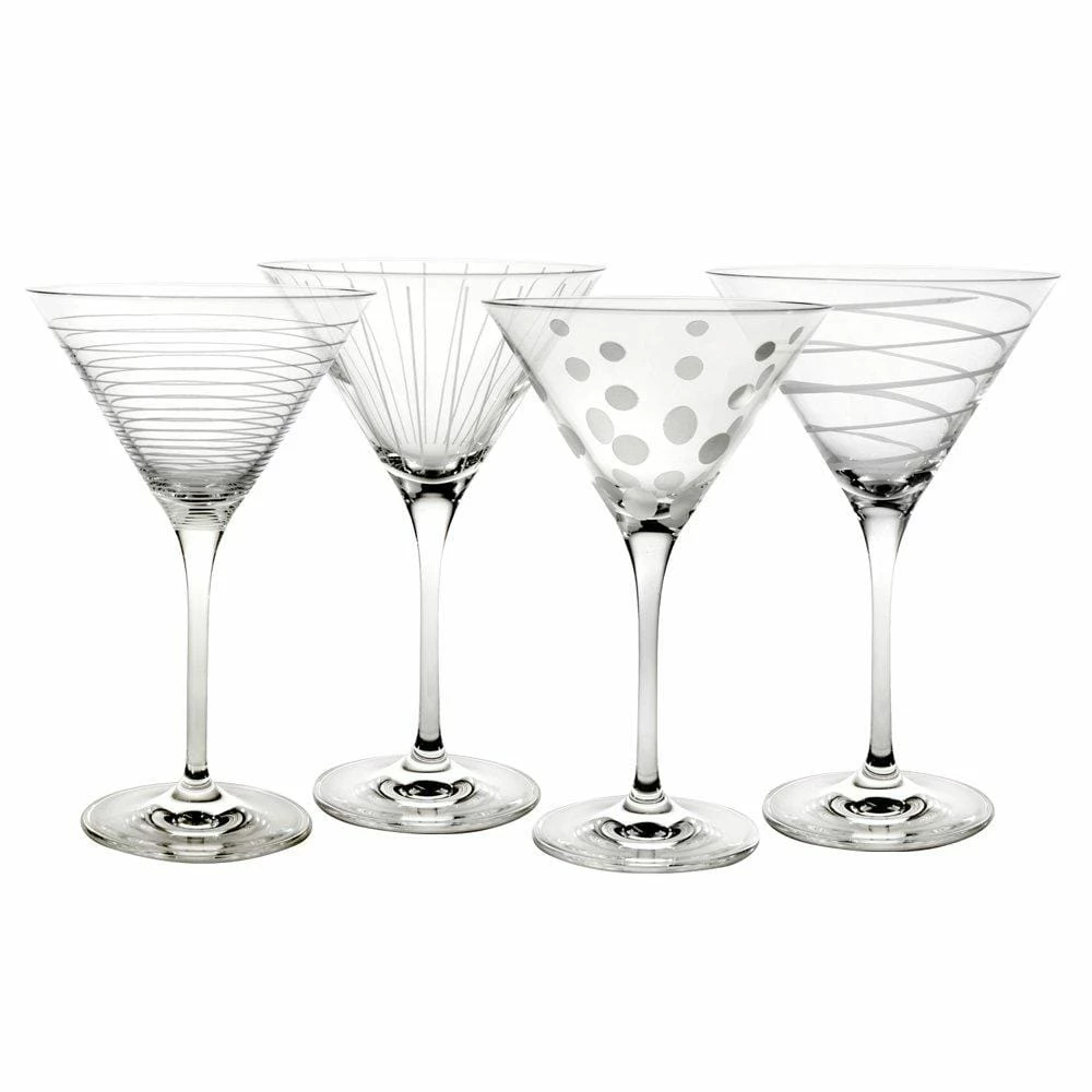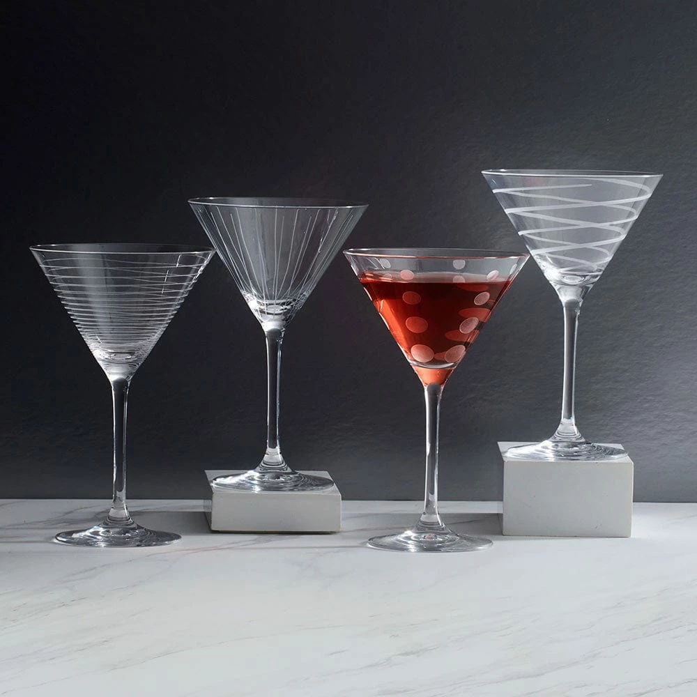 The fun and whimsical designs of the Cheers collection set a festive mood at any gathering. Each glass in the set of 4 is precision-etched with a different yet coordinating design. The dots, lines, and swirls are also distinctive, so each of your guests can easily identify their glass without the need for wine charms. You can also expand your collection with even more designs from the perfectly coordinating Cheers Too collection. Dishwasher safe – top rack. Set of 4 martini glasses, each measures 7-1/2 inch high and holds 10 ounces.