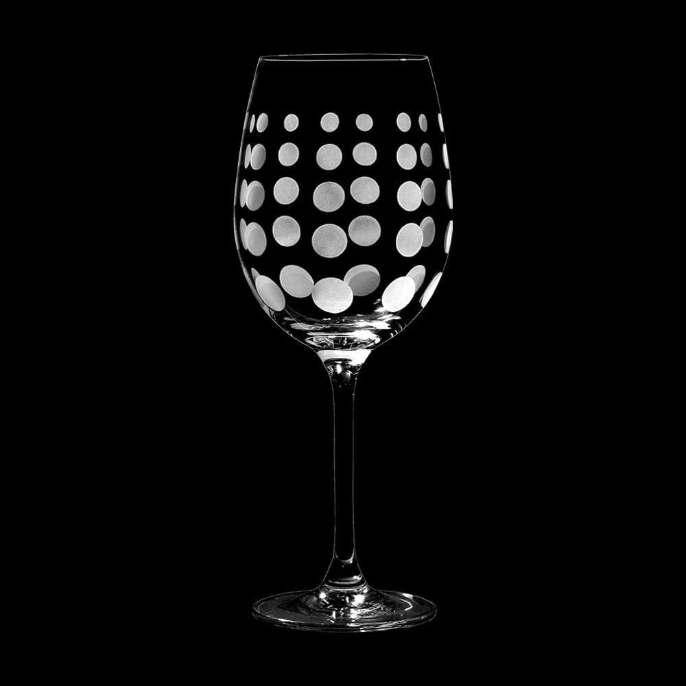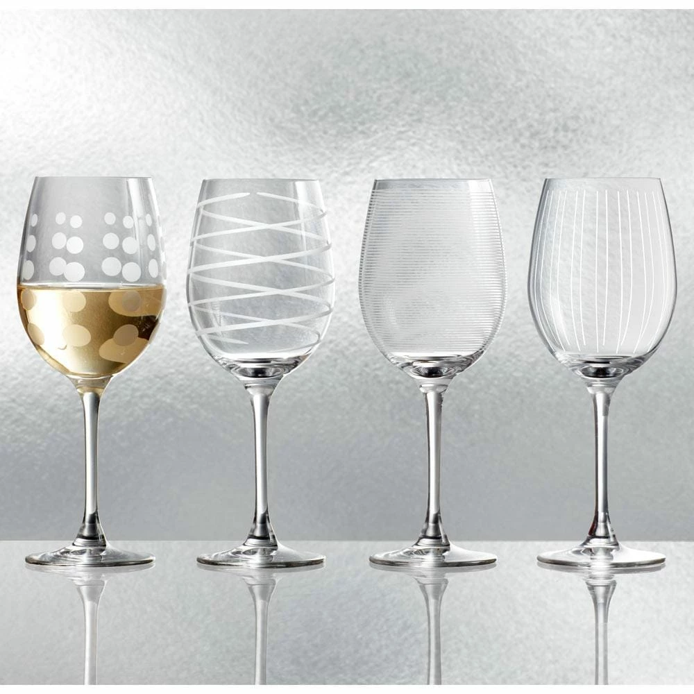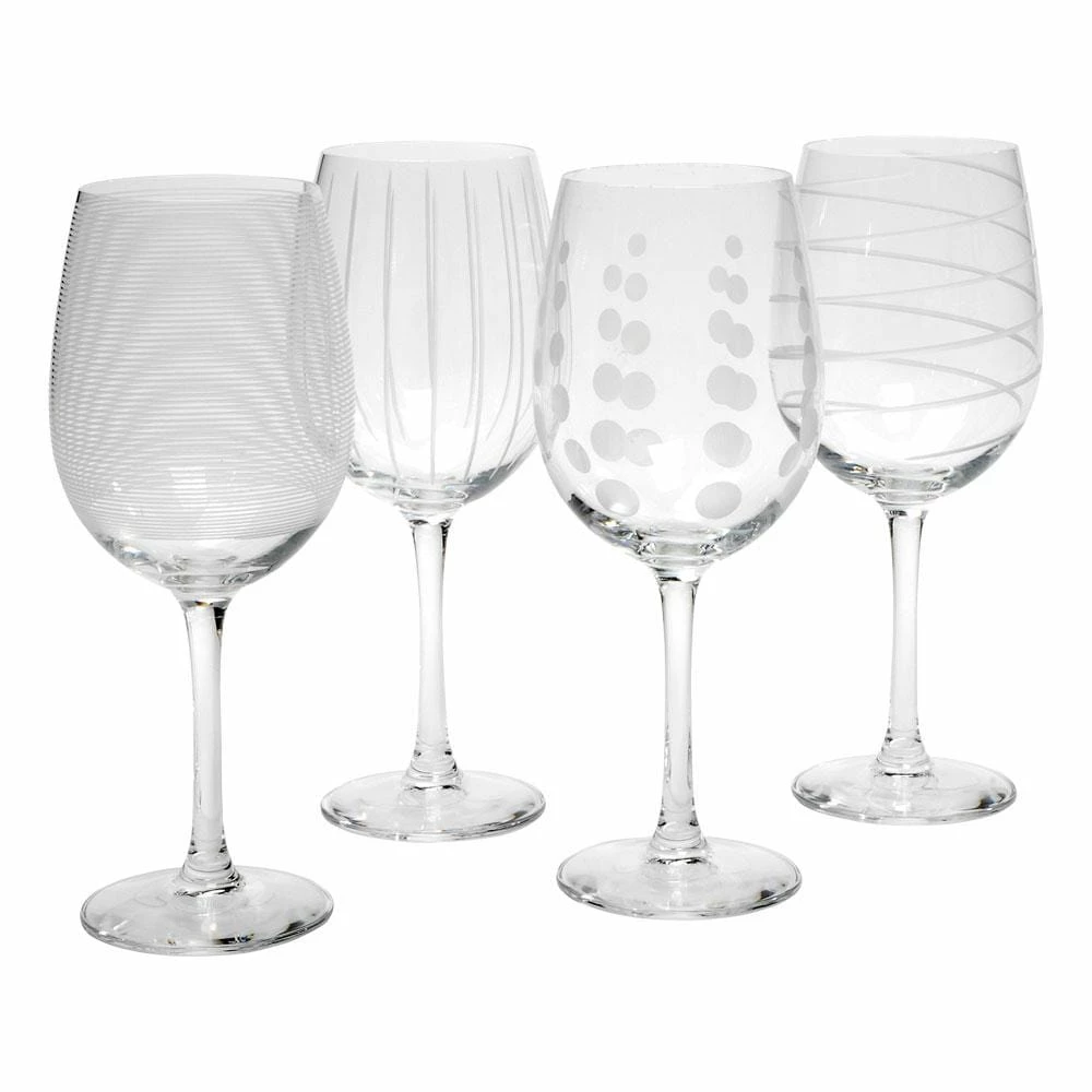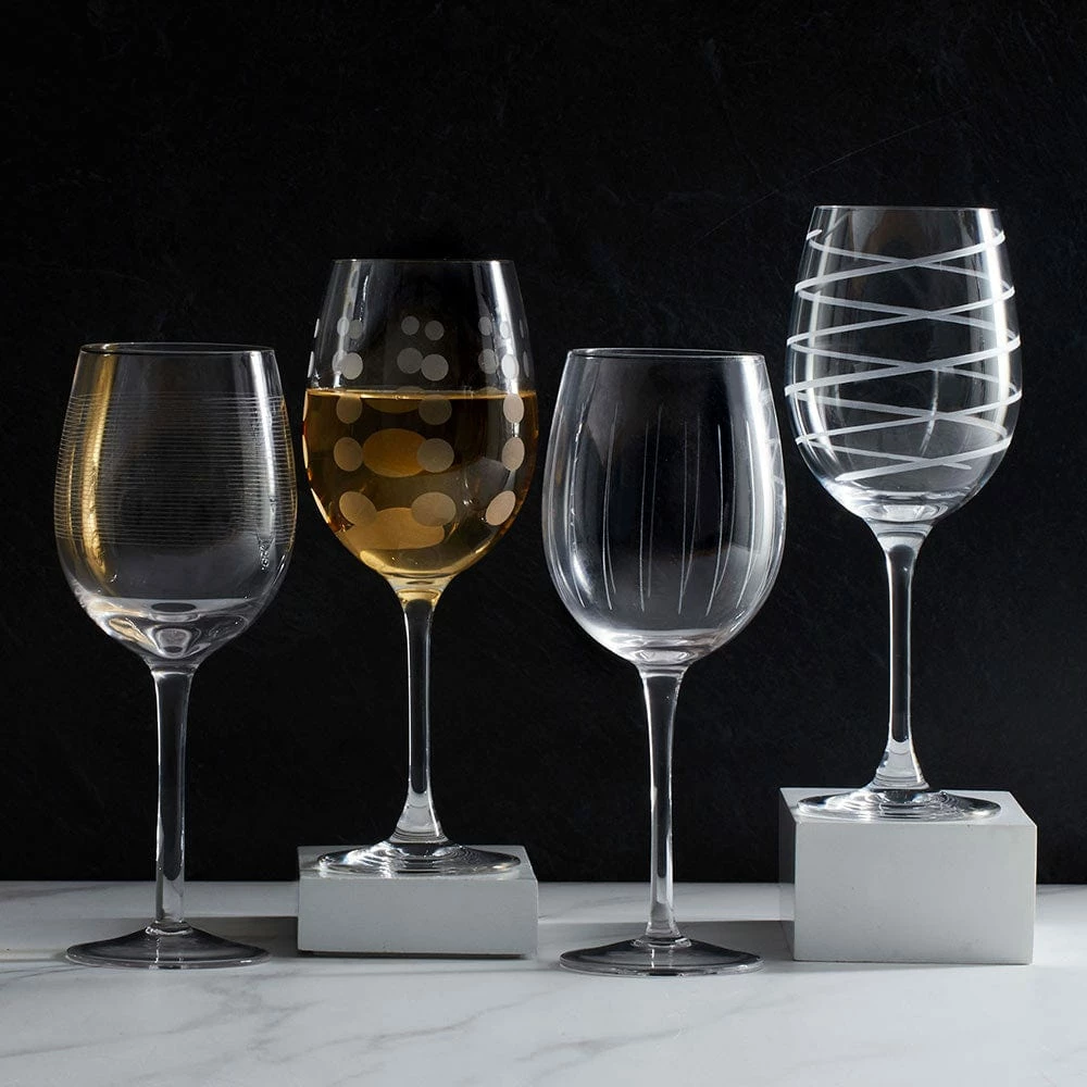 The fun and whimsical designs of the Cheers collection set a festive mood at any gathering. Each glass in the set of 4 is precision-etched with a different yet coordinating design. The dots, lines, and swirls are also distinctive, so each of your guests can easily identify their glass without the need for wine charms. Hand wash recommended. Set of 4 white wine glasses, each holds 16 ounces.
