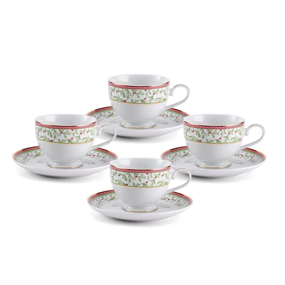 Bring some festive and elegant touches to your holiday celebration with Holiday Traditions. Elegant dinnerware features a charming holly and berry motif with gold banding for a timeless statement. Crafted of porcelain. Dishwasher safe, but not microwave safe. This teacup and saucer set is great for sipping a warm cup of fresh brewed tea. The 6-1/4 inch saucer protects your table from a teaspoon, as well as hold those tasty treats you like to enjoy with your coffee or tea. Teacup holds 8 ounce. Set of 4 Teacups & Saucers.