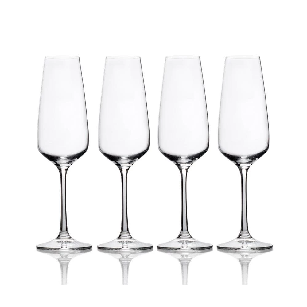 Melody glassware will add stylish simplicity to any tabletop display. Beautifully crafted of fine European lead-free crystal, these crisp, clear glasses bring subtle elegance to your place settings. Dishwasher safe. Set of 4 champagne flute glasses, each measures 2-3/4 inch diameter x 9-1/4 inch high and hold 9-1/2 ounces.