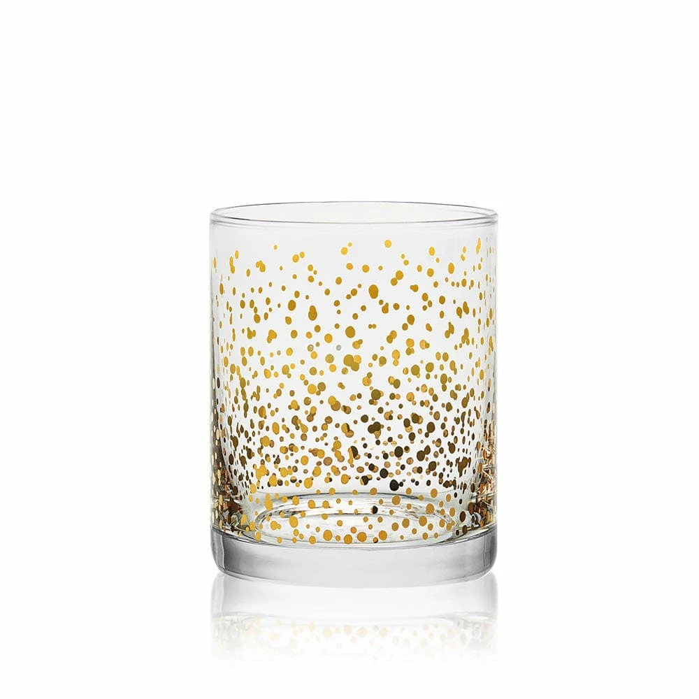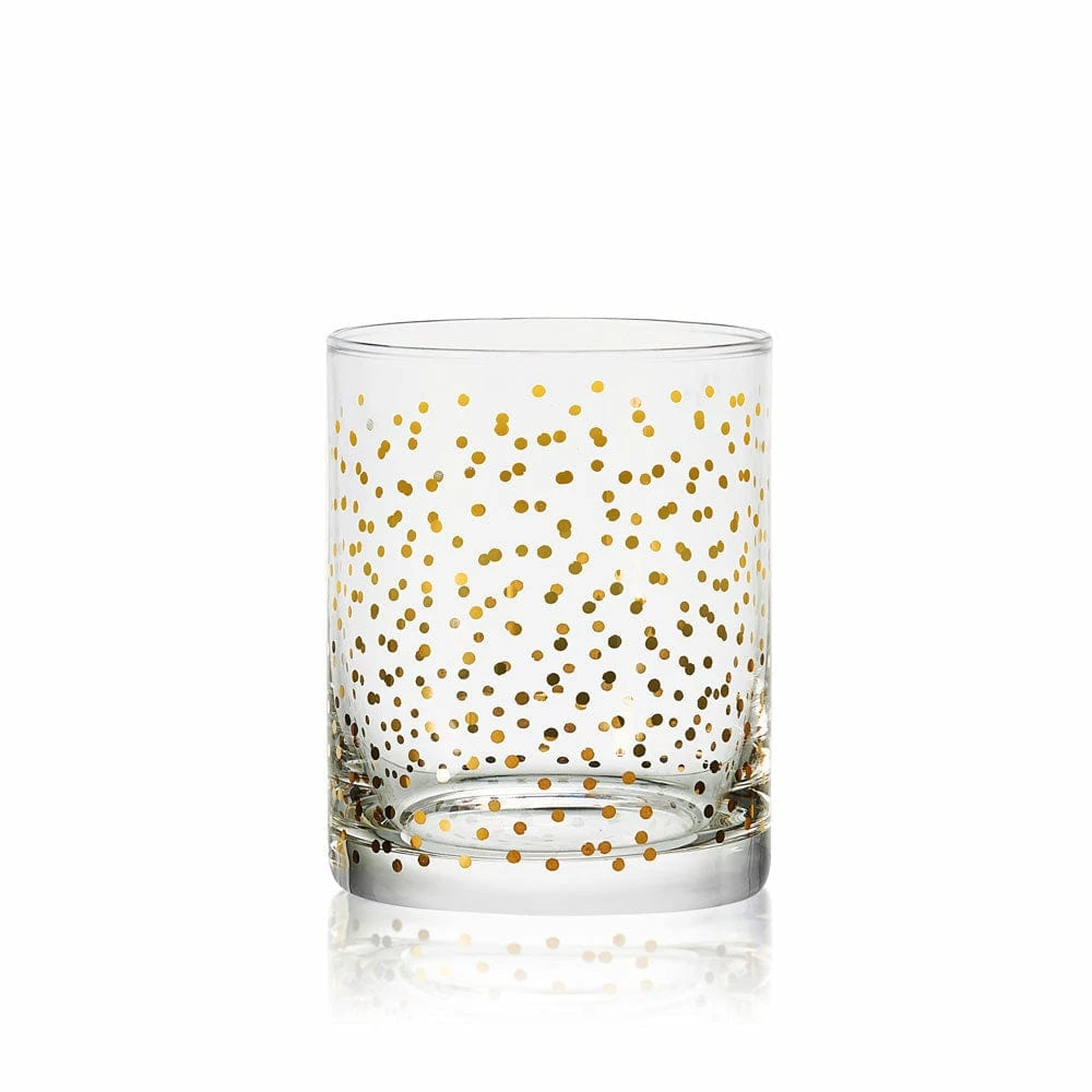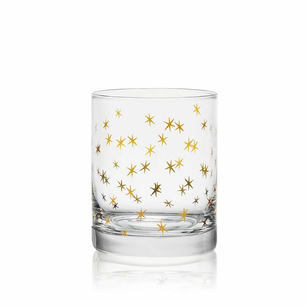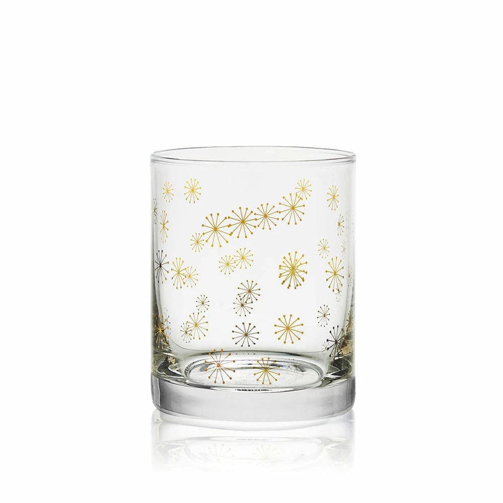 This Party Double Old Fashioned Whiskey Glass Set is sleek and streamlined with contemporary curves, and adorned with patterns of glittery gold and silver, featuring four distinct celebratory patterns, like sparkly confetti, shimmery bubbles, twinkling stars, and firework bursts.