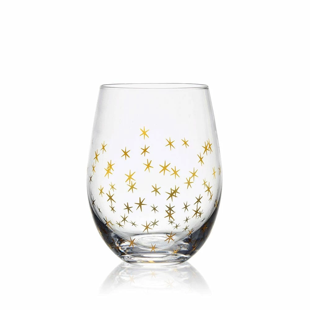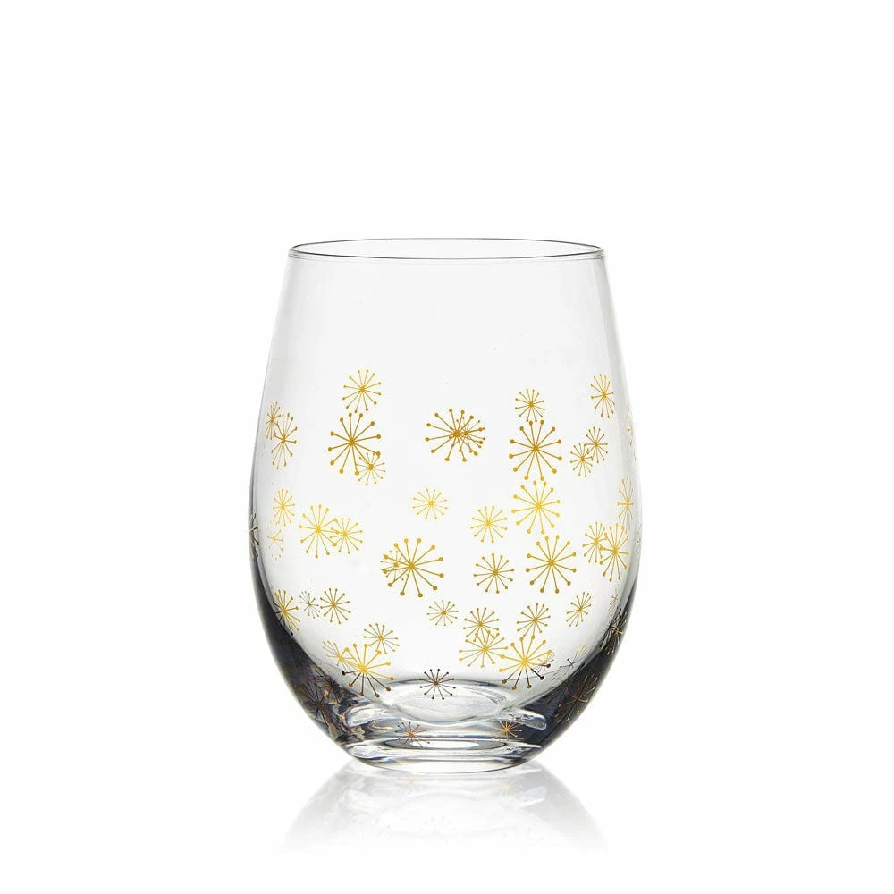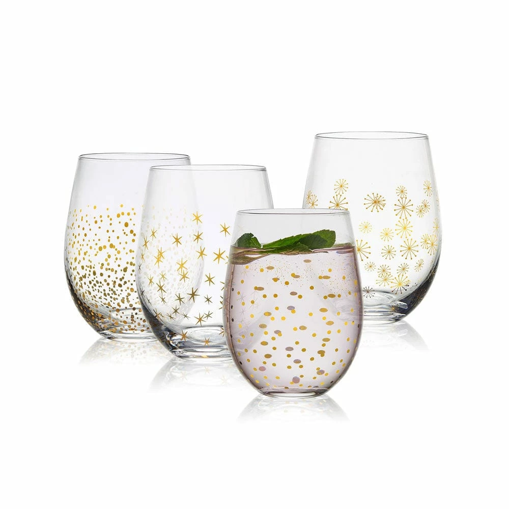 This Party Stemless Wine Glass Set is sleek and streamlined with contemporary curves, and adorned with patterns of glittery gold and silver, featuring four distinct celebratory patterns, like sparkly confetti, shimmery bubbles, twinkling stars, and firework bursts.